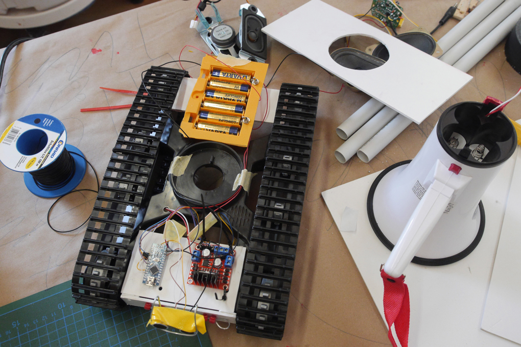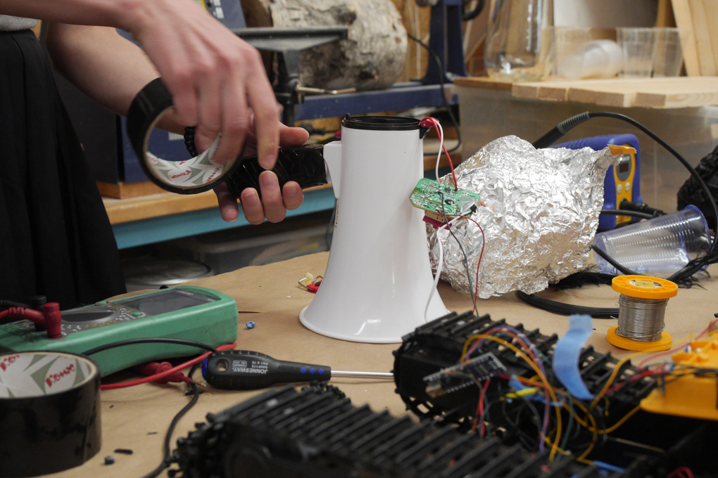 Each robot had its own soundtrack, which was played via the mp3 player attached to the megaphone. Here the first results are being listened to. / CC BY Niklas Roy & Kati Hyyppä