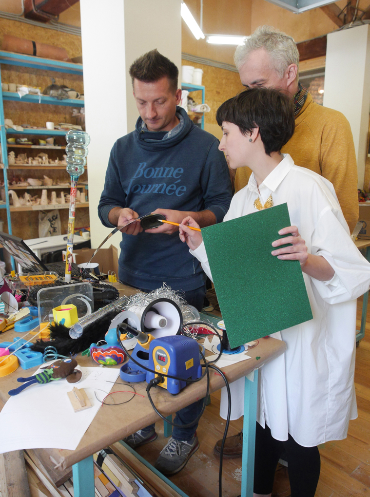 Team punk discussing what kind of glitter cardboard would suit their robot best. / CC BY Niklas Roy & Kati Hyyppä