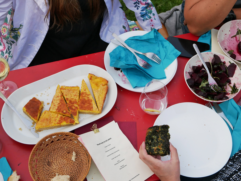 Community dinner at the Theater an der Parkaue in Lichtenberg, where we visited with our giant cloth. / CC BY Andrea Milde & Kati Hyyppä