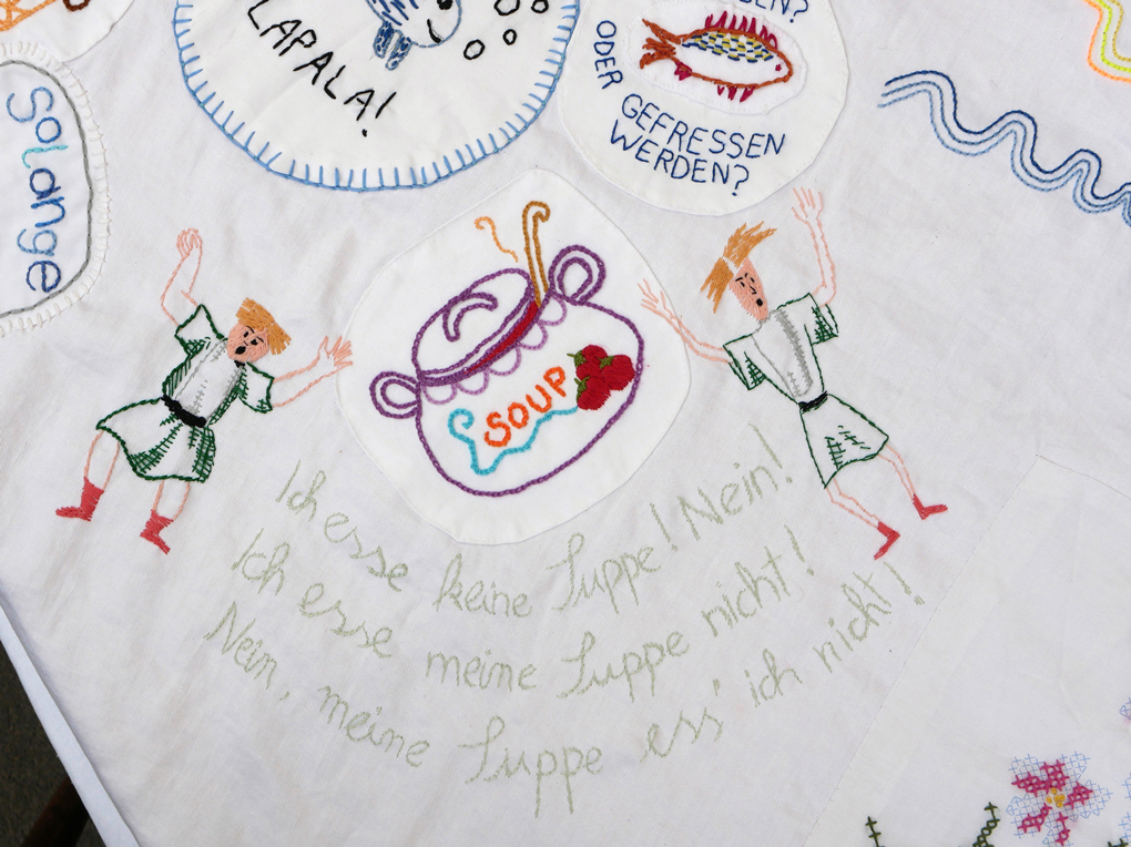 The 'Suppenkasper' is an old, educational figure still known to German children. He repeatedly refuses to eat his soup and sadly starves to death. Andrea embroidered him, inspired by the soup by my aunt, who likes to cook. / CC BY Andrea Milde & Kati Hyyppä