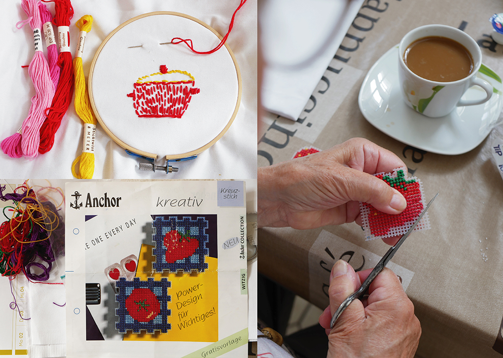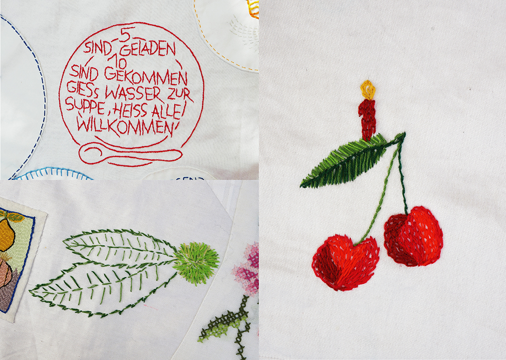 Some embroideries developed their meaning while working. Since the pot turned out slightly 'deformed ', it was because 'the cook forgot the stove on while he was drinking too much wine'. Also, when one of two strawberries, which were supposed be identical, ended up having a mistake, the motif became a game ('find the mistake'). / CC BY Andrea Milde & Kati Hyyppä