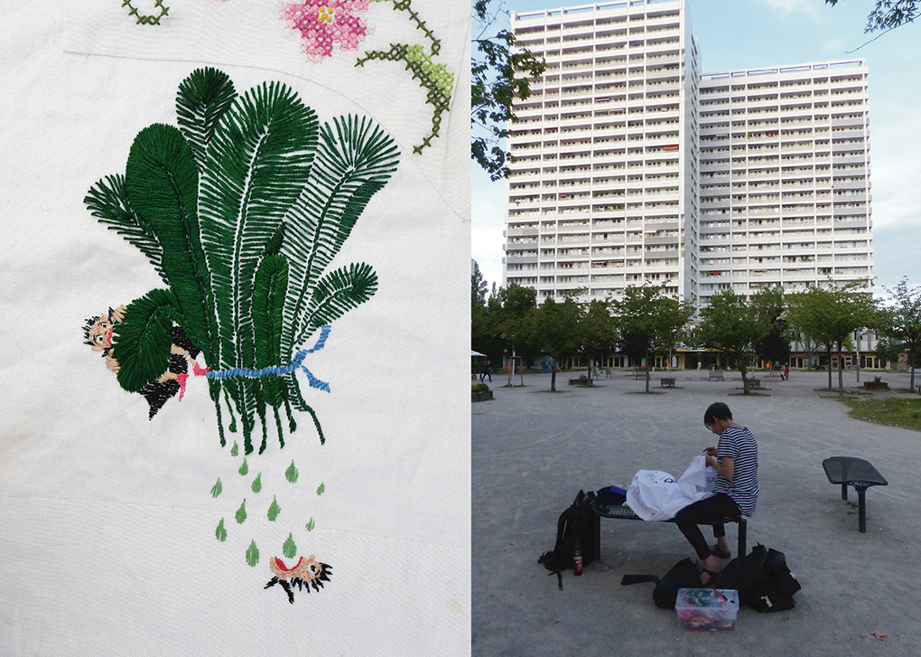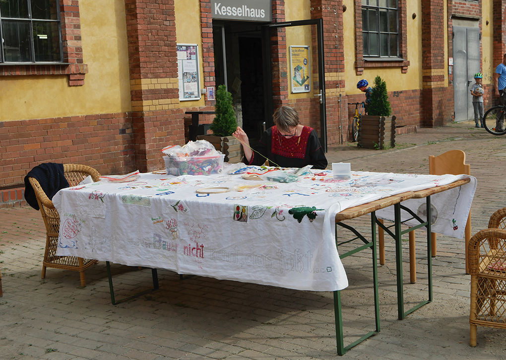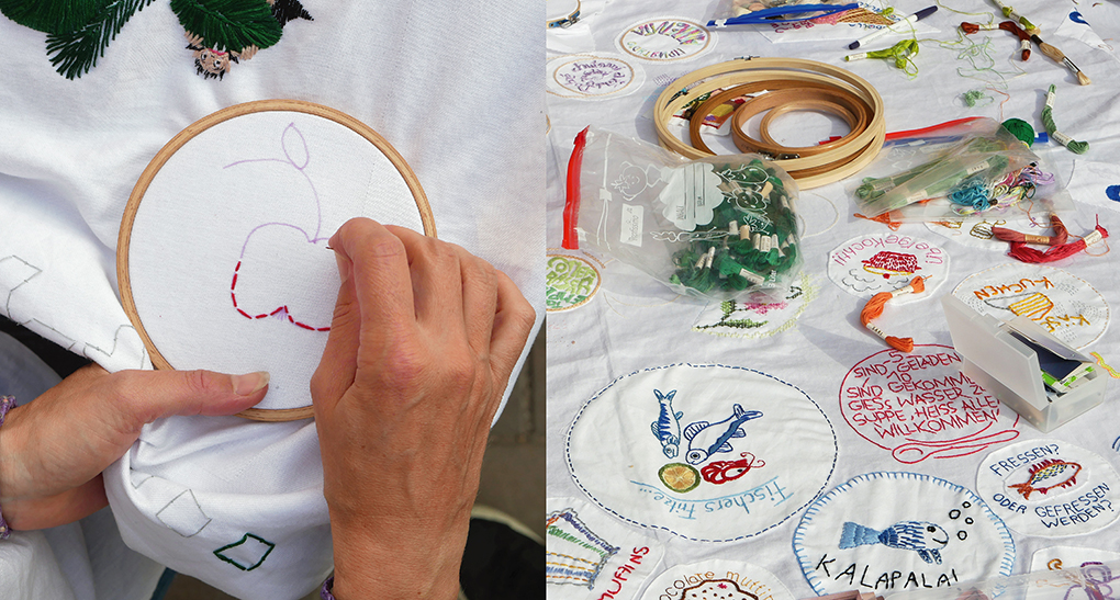 In the STICKSTOFF project we embroidered a giant tablecloth together with people from our neighbourhood, reflecting on the theme of eating together. / CC BY Andrea Milde & Kati Hyyppä