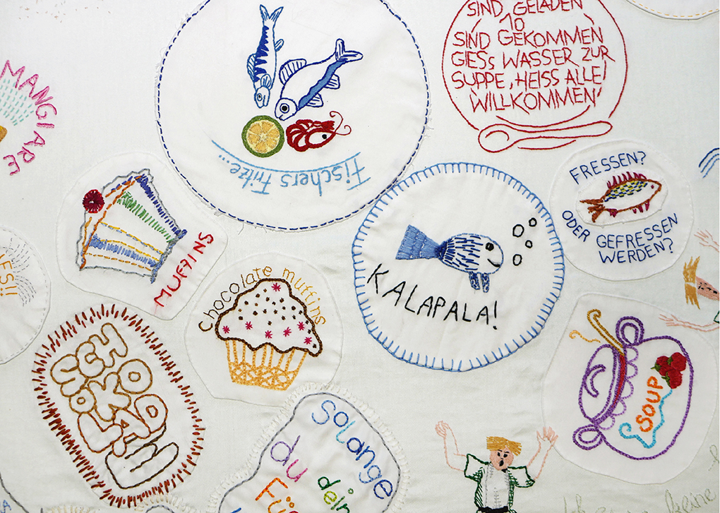 Kati's Finnish friends also contributed to the tablecloth with snacks eaten in the forest, melted ice cream, fish and muffins. / CC BY Andrea Milde & Kati Hyyppä