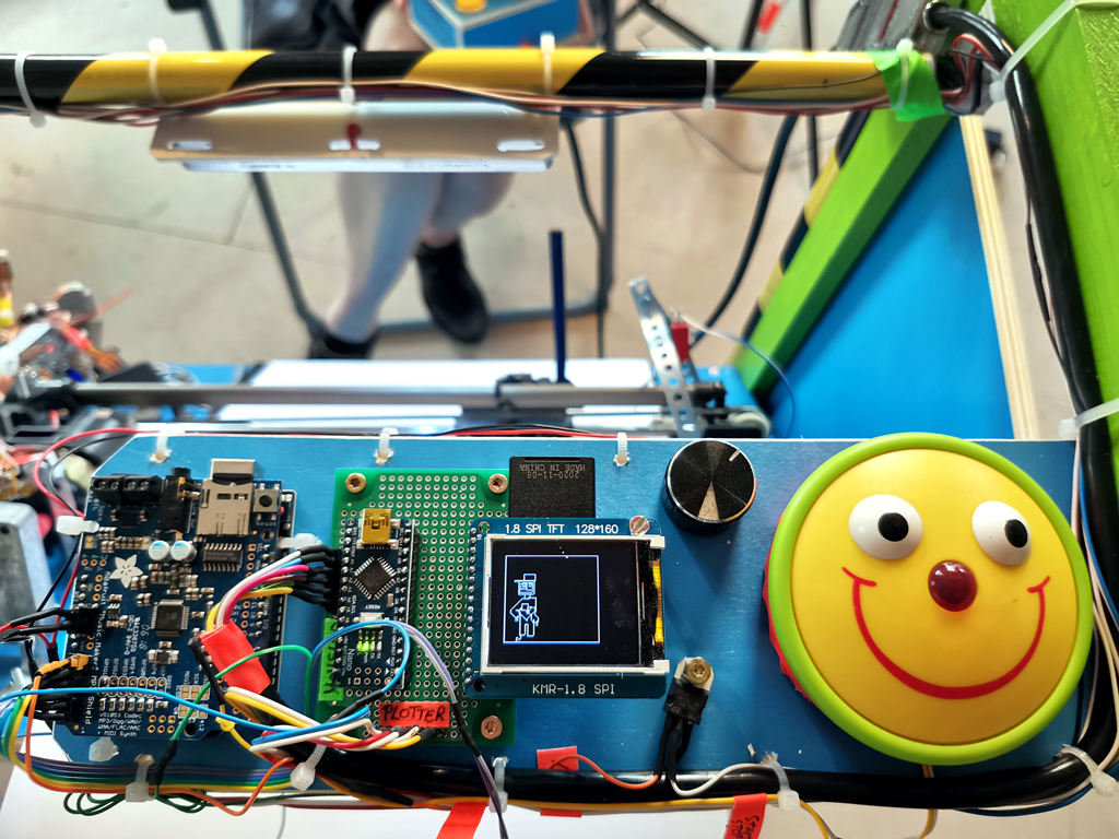 The coordinates of the line drawings are saved on an SD card and published at vektorkollektor.com for anyone to use. The small display shows the drawing while it's being drawn. The electronics also include an mp3-shield for playing chip tune-style music. The big, smiling, yellow button is for starting/stopping a drawing. / CC BY Niklas Roy & Kati Hyyppä