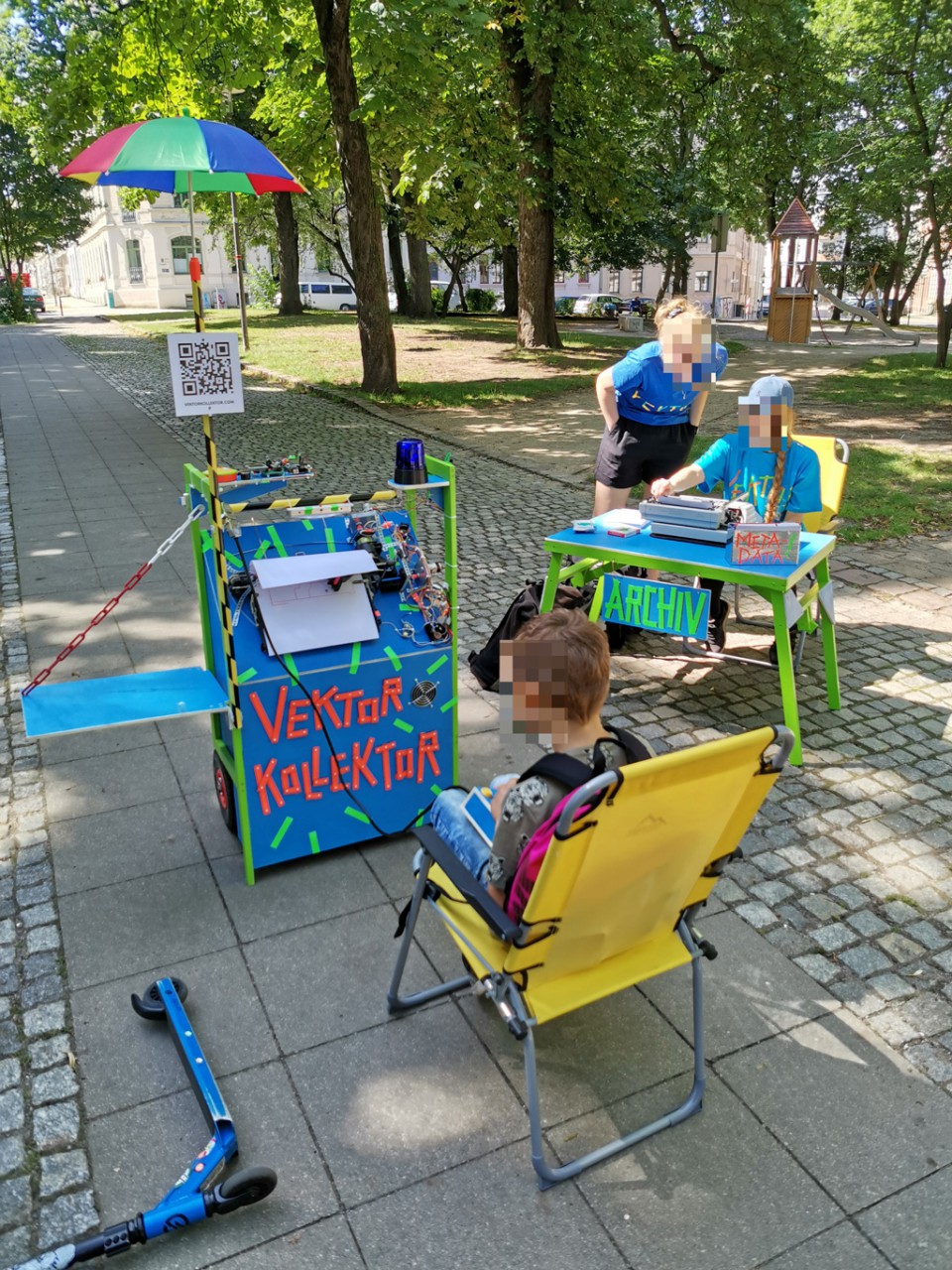Our first public location was Lessingplatz and we didn't have to wait long before people joined in to draw vectors. Getting used to typing with Erika was a bit of a hassle. / CC BY Niklas Roy & Kati Hyyppä