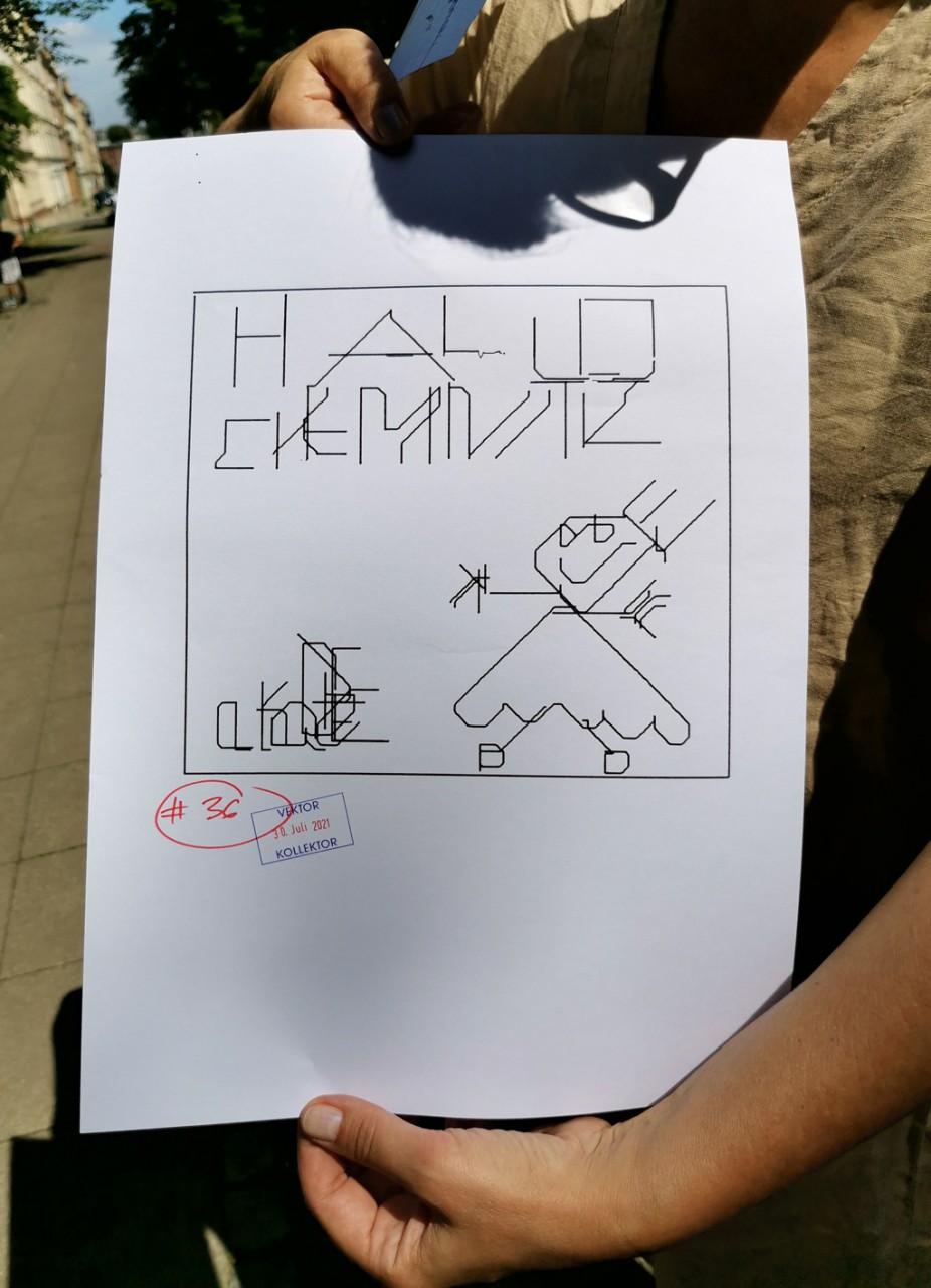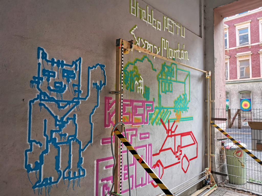 The vector archive can be used to make further creative works. In Chemnitz we used the drawings for making wall paintings with Niklas' big spray can plotter, which has the same .PLT file format as VEKTORKOLLEKTOR. / CC BY Niklas Roy & Kati Hyyppä