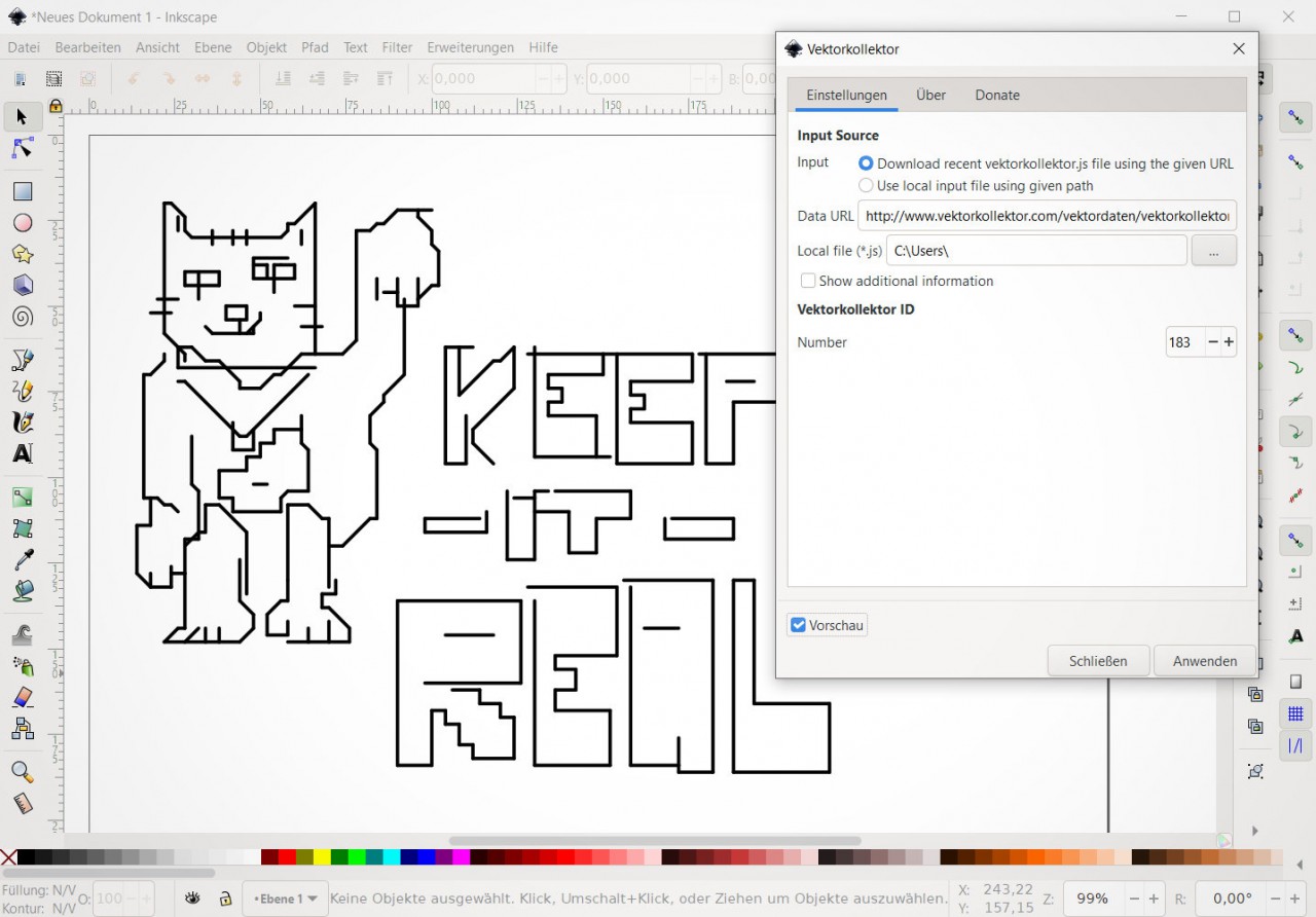 In order to make it easier to use the vector archive, Mario Voigt from FabLab Chemnitz created an Inkscape extension for converting the vectors into Scalable Vector Graphics (SVGs). This extension was used when plotting the images for the vectorscope cards.