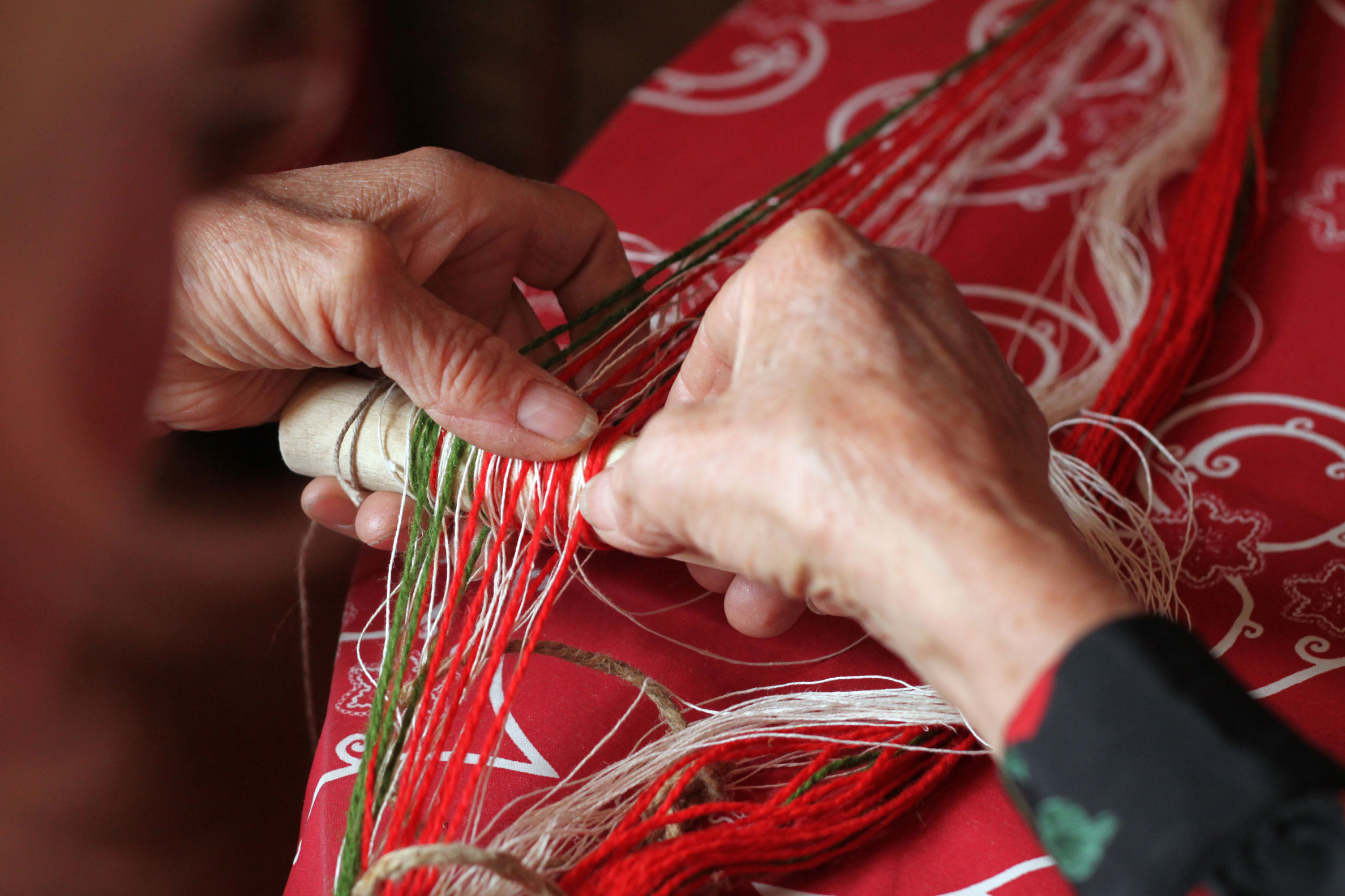 The other end of the bunch of yarns is attached to a table leg or other sturdy object. / CC BY Ramyah Gowrishankar & Kati Hyyppä