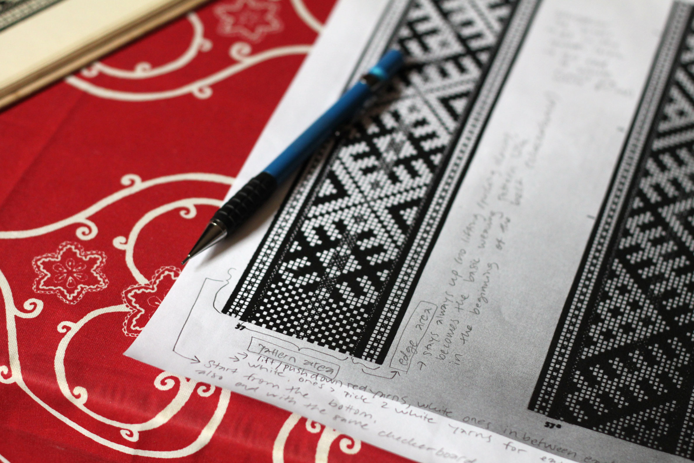 Once the beginning part is done, pattern weaving starts. The pattern is created by lifting specific red yarns according to each row in the patten diagram. / CC BY Ramyah Gowrishankar & Kati Hyyppä