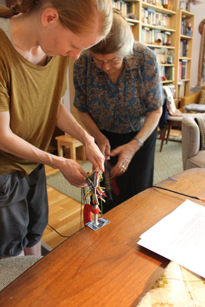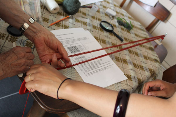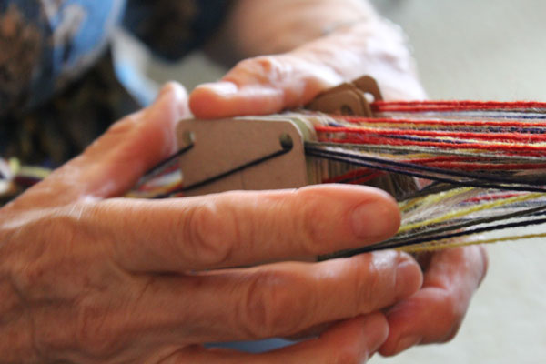 Here the loose end yarns are being sorted. The knotted end is tied to a holder to make handling easier. / CC BY Ramyah Gowrishankar & Kati Hyyppä
